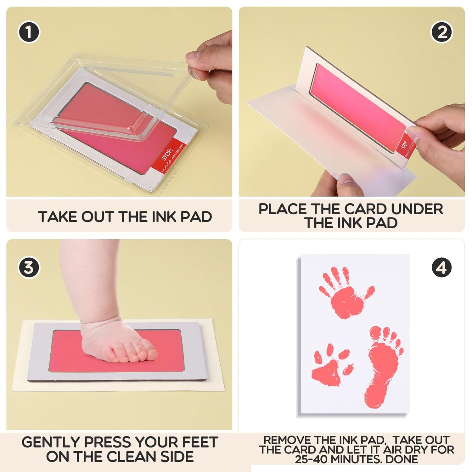 Features: Our baby handprint ornament kit serves as a thoughtful gift choice for new parents, grandparents, or at baby showers. Creating beautiful and unique mementos, this kit makes a heart touching gesture, giving the opportunity to savor those fleeting moments of infancy. These newborn hand and footprint kits can also be applied to collect pet paw prints, and frame them to place on table, shelf, or nursery wall, adding warm memories. Specifications: Material: safe material Color: black Size: Card: about 4.92 x 3.15 inches Ink surface: about 3.74 x 2.24 inches Package includes: 60 x Inkless fingerprint pad 120 x Imprint cards Notes: Manual measurement, please allow slight errors on size. The color may exist a slight difference due to different screen displays.