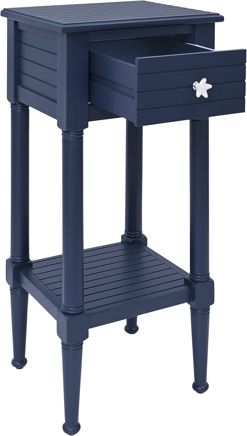Add coastal ambiance to your favorite space with this lovely nautically themed end table. Featuring a navy blue finish, this square wood table is the perfect place for a lamp and a cup of coffee while relaxing with a book. Adorned with a decorative starfish knob, the single drawer keeps essential items within easy reach, while the lower shelf is perfect for displaying photographs and keepsakes. Ideal as a living room side table, bedroom nightstand, or bathroom stand, this table will make a delightful accent to your home decor.