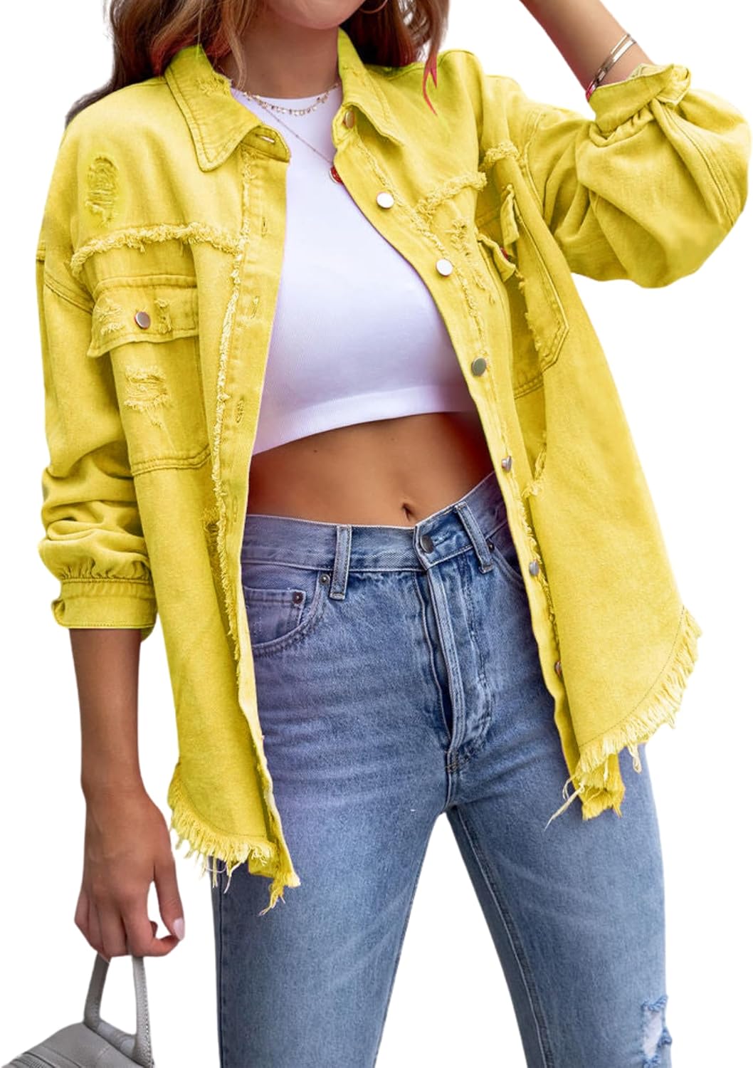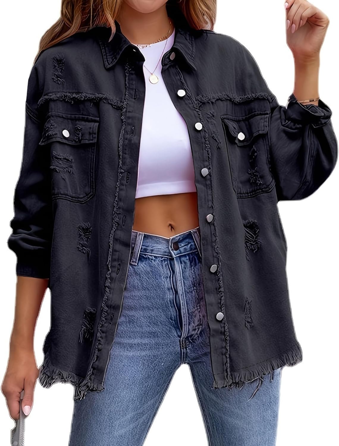 Elevate your spring wardrobe with the LIZALIG Women's Distressed Oversized Denim Jacket! This trendy button-down casual jean shacket is designed to give you that effortless boyfriend style with a modern twist. Featuring a stylishly ripped denim finish and a frayed hem, this jacket is perfect for layering over your favorite outfits. Crafted for comfort and versatility, the LIZALIG Denim Coat includes a classic lapel and a button front that adds a touch of western charm. The oversized fit makes it ideal for pairing with everything from dresses to casual jeans, making it a staple piece for any fashion-forward woman. With spacious pockets for convenience, this classic basic long sleeve spring jean coat is not only functional but also incredibly fashionable. Whether you're heading out for a casual day or dressing up for a night out, the LIZALIG Distressed Trucker Jacket will keep you looking chic and feeling comfortable. Make a statement this season with the 2026 Classic Lapel Frayed Hem Button Down Denim Coat. Embrace the laid-back vibe of spring with this essential addition to your wardrobe – the ultimate blend of style and practicality!